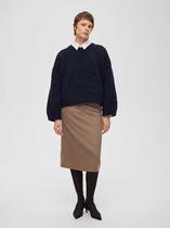 Вязаный джемпер умеренного объема из акриловой пряжи с добавлением шерсти, переплетение гладь (изнаночные петли). Спущенный длинный рукав, округлая горловина с бейкой. По низу изделия и рукавов широкие манжеты. По бокам разрезы.