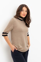 Джемпер из трикотажного полотна джерси фактурное, свободного кроя. Округлая горловина с обтачкой. Длинный рукав со спущенной линией плеча, по низу манжеты. По переду декоративные защипы. По низу изделия манжет с боковыми разрезами.
