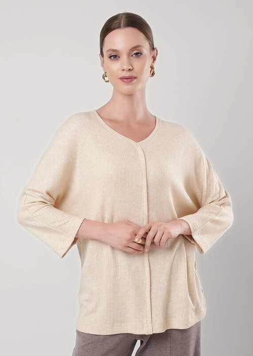Джемпер свободного кроя из трикотажного полотна кашкорсе. По горловине притачная обтачка, переходящая на перед. Длинный цельнокроенный рукав спереди, по спинке спущенный. По переду и спинке средний шов.