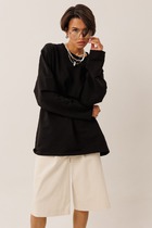 Джемпер из трикотажного полотна вискоза вязанная. Округлая горловина с обтачкой. Перед комбинированный (лицо,изнанка) фигурный рез. Втачной длинный рукав, внизу манжет (изнанка ворс). По низу изделия манжет со шнуром. Спереди вышивка.