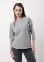 Джемпер свободного кроя из вискозного трикотажного полотна. Округлая горловина с обтачкой. Цельнокроеный рукав длиной 3/4. По переду и спинке отстроченные резы. По спинке средний шов. По бокам небольшие разрезы. Спереди принт фольга.