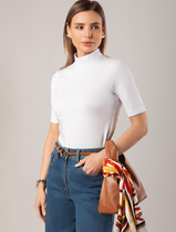 Вязаный джемпер прямого силуэта из вискозной пряжи с добавлением нейлона. Короткий втачной рукав. Основное переплетение гладь. Округлая горловина с бейкой. По низу изделия и рукавов манжеты.