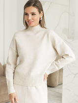 Вязаный джемпер умеренного объема из акриловой пряжи с добавлением хлопка, переплетение полуфанг. Округлая горловина с бейкой. Длинный рукав со спущенной линией плеча. По низу изделия и рукава манжет. Спереди нашивка металл.