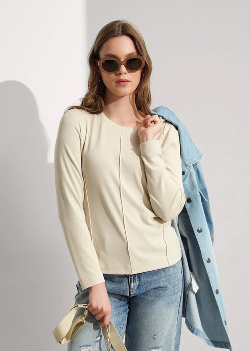 Фуфайка прямого силуэта из поливискозного трикотажного полотна кашкорсе. Втачной длинный рукав. Округлая горловина с обтачкой. По переду декоративные защипы.
