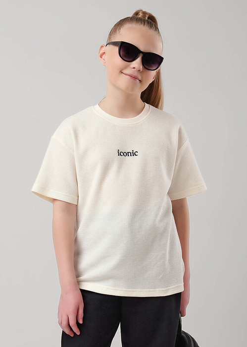Стильная футболка из фактурного трикотажа станет идеальным дополнением к вашему гардеробу. Модель оверсайз обеспечивает максимальный комфорт. Декоративная вышивка по переду придаёт изделию индивидуальность.