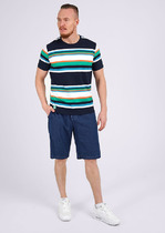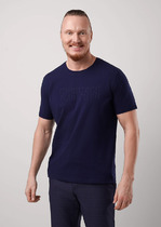 Футболка мужская из хлопкового полотна с эластаном, круглым вырезом горловины и коротким втачным рукавом. Оригинальность изделию придают контрастные канты по горловине и рукавам, а так же фактурный дизайнерский принт.