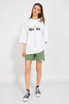 Джемпер оверсайз из эластичного трикотажного полотна. Короткий спущенный рукав. Круглый вырез горловины обработан кашкорсе. По переду принт.