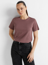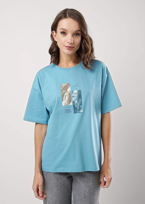 Футболка из хлопкового трикотажного полотна. Короткий спущенный рукав. Округлый вырез горловины с обтачкой из рибаны. По переду принт.