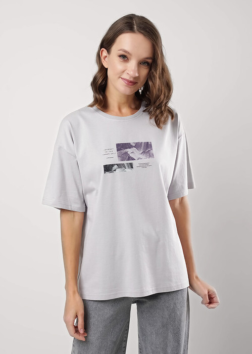 Футболка из хлопкового трикотажного полотна. Короткий спущенный рукав. Округлый вырез горловины с обтачкой из рибаны. По переду принт.