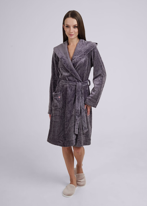 Женский халат из фактурного велсофта на запах с поясом и капюшоном, рукав полной длины, на переде накладной карман с вышивкой.