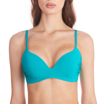 Костюм купальный женский однотонный из полиамида с эластаном. Лиф с прямоугольными чашечками на завязках вокруг шеи, с металлическим декором спереди. Трусы бикини на высокой посадке.