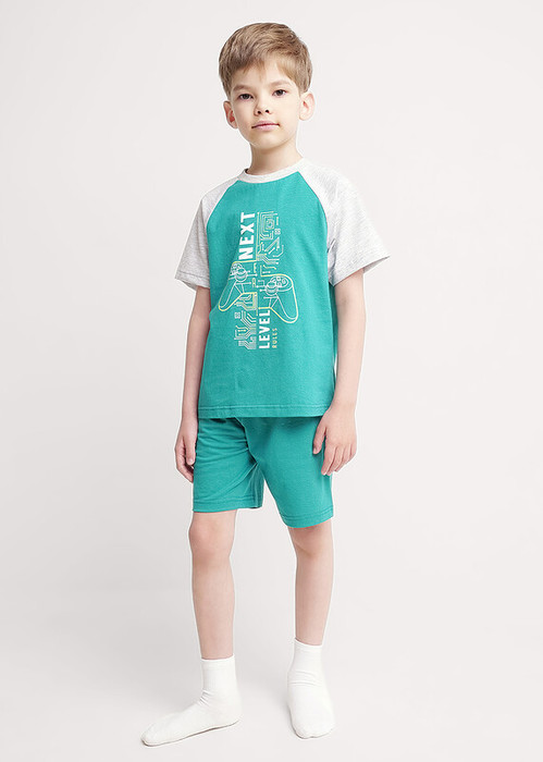 Комплект хлопковой пижамы из футболки и шорт. Футболка свободного кроя дополнена эластичной горловиной и стильным принтом. Шорты среднего объема, эластичный пояс обеспечит комфорт и идеальную посадку.