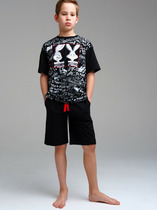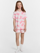 Комплект хлопковой пижамы из футболки и брюк. Футболка свободного кроя дополнена эластичной горловиной и стильным принтом. Брюки среднего объема, эластичный пояс обеспечит комфорт и идеальную посадку. По низу брюк эластичные манжеты.
