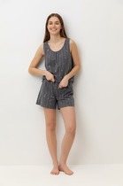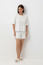 Набор одежды из трикотажного полотна.Футболка прямого кроя,по горловине обтачка с контрастным цепным стежком.Короткий втачной рукав,внизу вышивка.Спереди принт со вспенкой. По бокам разрезы. Бриджы на резинке с киперной лентой. Карманы с отрезным бочком.