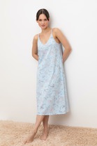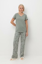 Пижама для дома из хлопкового трикотажного полотна. Майка прямого силуэта, на узких бретелях. По горловине и пройме окантовка. Короткие шорты свободного кроя, цельнокроеный пояс на внутренней резинке.