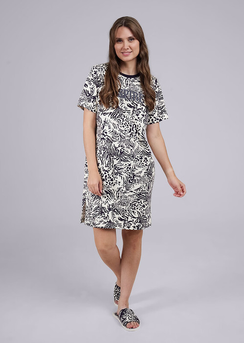 Платье для дома из хлопкового трикотажного полотна, прямого силуэта. Короткий втачной рукав. Округлая горловина с обтачкой. Боковые карманы в швах, по бокам разрезы. На детали переда принт.