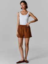 Шорты длинные, свободные из текстильного полотна штапель. По талии притачной пояс со шлевками, по переду гульфик, складки. По спинке вытачки. Спереди металл нашивка на шлевке.