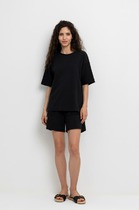 Шорты длинные свободные из трикотажного полотна пике. По талии притачной пояс на внутренней резинке. По переду средний шов, переходящий в складку. Боковые карманы с отрезным бочком.