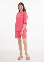 Шорты для дома из хлопкового трикотажного полотна, длинные свободные. Пояс на внутренней резинке, боковые карманы с отрезным бочком.