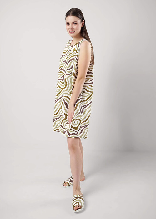 Сорочка ночная для дома и отдыха из хлопкового трикотажного полотна, А-силуэта, без рукавов. По горловине и пройме обтачка. Рельефы по переду. На детали переда принт вспенка, внизу нашивка кокос.
