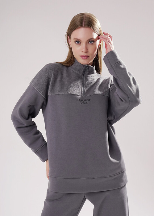 Джемпер спортивный свободного силуэта из трикотажного полотна футер с начесом ""тедди"". По горловине стойка с молнией. Спереди и по спинке кокетка наизнанку. Длинный рукав со спущенной линией плеча, по низу манжет. Внизу изделия притачной пояс.