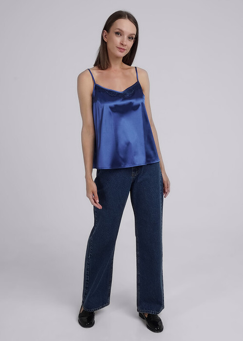 Блузка из атласного полотна немного расклешенная книзу. Тонкие бретели с регулировками. V- образная горловина. По горловине кружево.