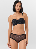Трусы-бикини женские из полиамида с эластаном. По переду вставки из сетки. Обработка краев - подклееный край. Хлопковая ластовица.
