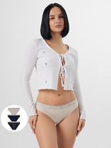 Бразилиано. Комбинированная модель: перед - однотонное хлопковое полотно, спинка и отрезной бочок - кружево. По талии - резинка с фестоном. В центре на детали переда расположен небольшой атласный бант. Декорированы симметричными элементами из кружевной тесьмы,расположенными по линии реза