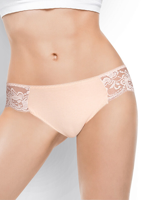 Трусы слипы женские из эластичного хлопкового полотна. Обработка краев - ажурная резинка с фестоном. По переду и спинке вставки из кружева.
