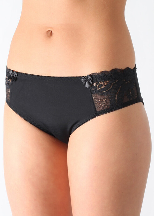 Классическая модель из однотонного трикотажа. На детали переда - симметричные кружевные вставки. По ножке и талии - резинка с фестоном. На детали переда - небольшой атласный бант.