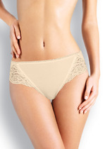 Классическая модель удобной посадки. Изделие комбинированное: перед - кружевное полотно, спинка - трикотаж. По ножкам - резинка с фестоном, по талии - отделкакружевом. На детали переда по центру - небольшой атласный бант.