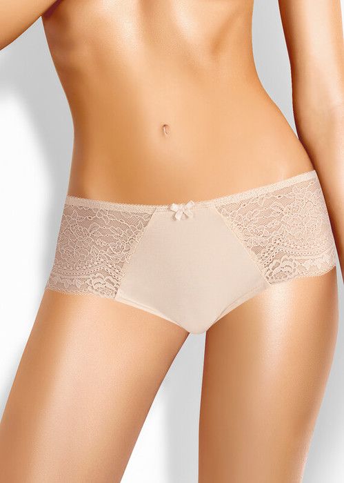 Трусы-шорты женские из эластичного хлопкового полотна. По спинке и бокам кружево. Обработка краев по талии - ажурная резинка с фестоном. Спереди бант.