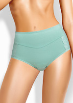 Трусы слипы женские из эластичного хлопкового полотна. По бокам вставки из кружева. Обработка краев по талии и ноге - ажурная резинка с фестоном, точечный зигзаг. По переду атласный бант.