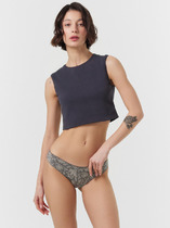 Трусы стринги комфортной посадки. В отрезном бочке -кружево, переходящее на спинку. По поясу и ножкам-обработка резинкой с фестоном. На детали переда расположен небольшой атласный бант.