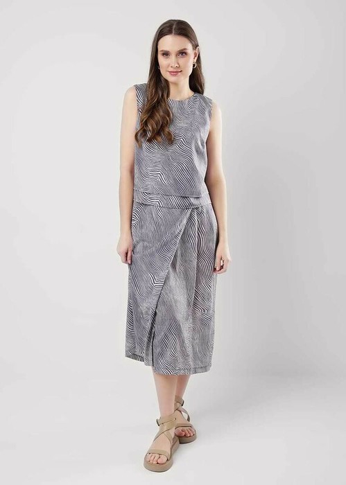 Юбка из текстильного полотна штапель, А-образного силуэта длиной миди. Спереди ассиметричный запах. По талии притачной пояс, сзади на внутренней резинке, спереди завязки из окантовки. По спинке короткий подклад из основного полотна, средний шов.