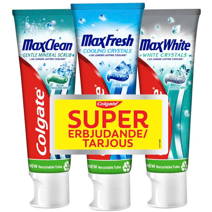 Три разные зубные пасты Colgate в одной упаковке. Max Fresh Cooling Crystals 75 мл: содержит кристаллы, которые эффективно освежают дыхание. Max White White Crystals 75 мл: высвобождает отбеливающие кристаллы на поверхности зубов, помогая восстановить естественную белизну зубов. Max Clean Gentle Mineral Scrub 75 мл: эффективно и тщательно очищает полость рта до линии десен.