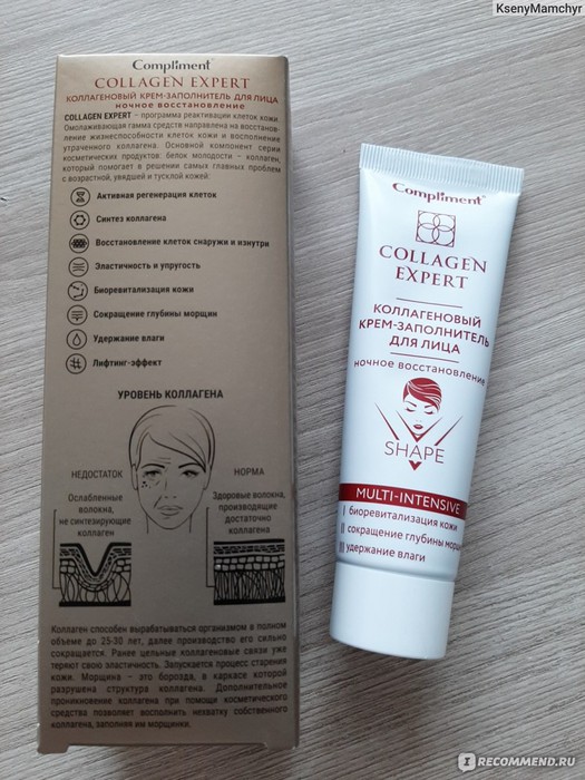*Коллаген в основе косметического продукта заполняет морщинки, кожа разглаживается и становится заметно более подтянутой. Коллагеновый крем-заполнитель для лица Compliment оказывает целенаправленное воздействие на упругость, эластичность и тонус кожи.