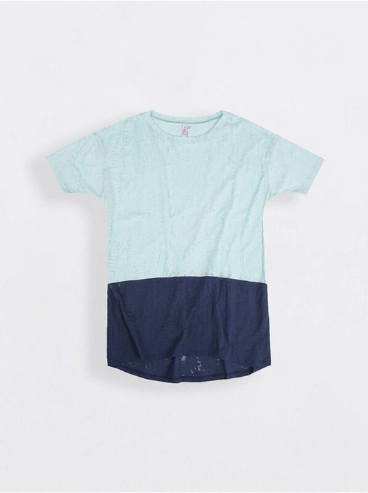 Джемпер женский удлиненный с коротким втачным рукавом. Линия плеча - спущенная. Горловина изделия обработана планкой. Трикотажное полотно с эффектом "вытравка". Верхняя и нижняя части джемпера - контрастные.