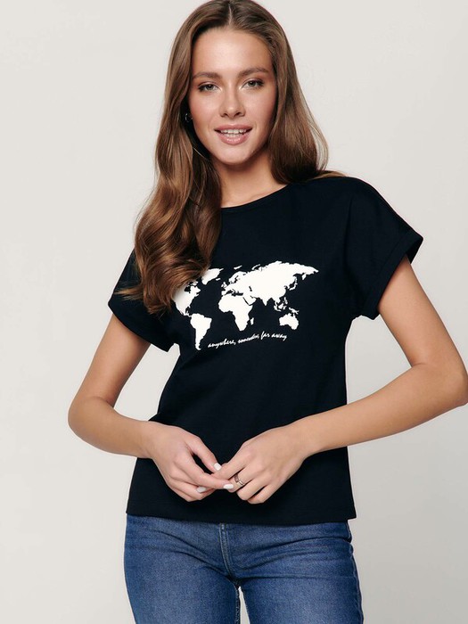 Черная футболка прямого силуэта LD 1231 из мягкого хлопка сочетает в себе минимализм и оригинальные тенденции уличной моды. · прямой силуэт· круглый вырез горловины· спущенная линия плеча· короткий рукав с отложным цельнокроеным манжетом· рисунок «Anywhere, somewhere, far away»· мягкий 100% хлопок· устойчивый цвет и сохранение формы при соблюдении рекомендаций по уходу· прекрасный вариант на каждый день.
