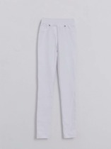 Леггинсы женские из эластичного трикотажного полотна "джинс". По задним половинкам кокетка и четыре горизонтальные вытачки, два накладных кармана с двумя хольнитенами по концам. По переду имитация гульфика и боковых карманов. Пояс приточной с широкой эластичной тесьмой внутри. По швам притачивания кокеток и пояс, выполнены двойные отделочные строчки, по средним швам переда и спинки, горизонтальным выточкам и в верхней части боковых швов выполнена одинарная отделочная строчка.