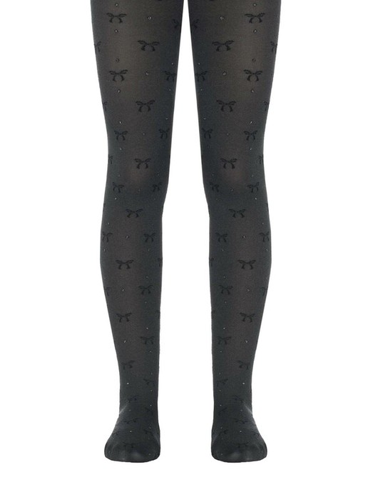 Плотные эластичные меланжевые фантазийные колготки 50 DEN из нитей микрофибры и LYCRA. Рисунок "бантики" выполнен из черной полиамидной нити, рисунок "точки" выполнен из люрексовой нити, комфортный плоский шов, уплотненный мысок.