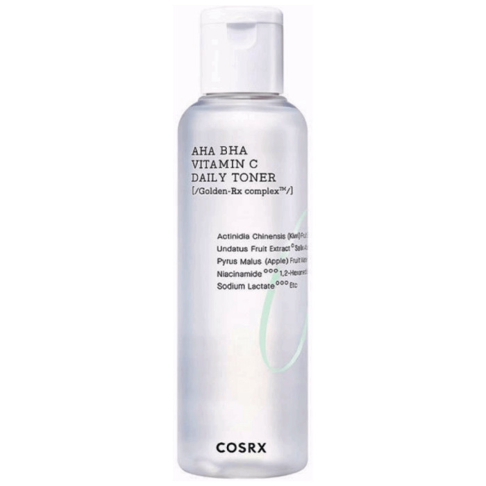 Тоник-эксфолиант с витамином С Cosrx Refresh AHA BHA Vitamin C Daily Toner мягко отшелушивает ороговевшие клетки и готовит кожу к последующему нанесению средств.Тоник подходит для ежедневного применения, смягчает, увлажняет, способствует удержанию влаги в клетках. Оказывает антиоксидантный эффект, сокращает последствия негативного влияния ультрафиолетового излучения, предупреждает появление признаков преждевременного старения.Средство помогает восстановить защитный липидный барьер, регулирует выработку себума, предупреждает появление воспалений и акне, выравнивает тон и рельеф, борется с тусклостью и придаёт здоровый, отдохнувший вид.Тоник содержит витамин С, который обладает выраженным антиоксидантным действием, эффективно защищает кожу от повреждений ультрафиолетовым излучением, стимулирует выработку собственного коллагена, способствует повышению эластичности, упругости и увлажнённости кожи, помогает затормозить процесс гликации (склеивания волокон коллагена глюкозой), уменьшает пигментные пятна и постакне, выравнивает цвет лица и придаёт здоровое сияние. В средстве содержится стабильная форма витамина С, которая воздействует наиболее мягко, подходит для чувствительной кожи, а также не требует хранения в холодильникеСредство также содержит:AHA (гликолевая кислота) отшелушивает ороговевшие клетки, стимулирует обновление эпидермиса, осветляет, обеспечивает глубокое очищение кожи.BHA (салициловая кислота) оказывает антимикробное воздействие, нормализует pH кожи и работу сальных желез, предотвращает воспаления, чёрные точки и жирный блеск.Ниацинамид (витамин B3) осветляет пигментацию и предотвращает её появление, нормализует выработку себума, уменьшает блеск в Т-зоне, повышает защитные функции кожи.Аденозин регулирует окислительно-восстановительные процессы в клетках кожи, ускоряет регенерацию клеток, благодаря чему замедляет процессы старения, поддерживает эластичность и упругость, уменьшает глубину морщин.Экстракт киви тонизирует, обладает легким отшелушивающим эффектом, стимулируя клеточное обновление. Ускоряет заживление акне и воспалений.Подходит для жирной и комбинированной кожиСпособ применения: нанесите необходимое количество средства на ватный диск и протрите им очищенную при помощи пенки кожу.Объём: 150 мл