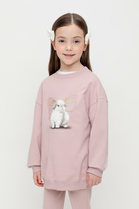 Удлиненный свитшот для девочки из высококачественного футера трехнитки. Обтачка горловины, манжеты и пояс выполнены из эластичного полотна. Оригинальный принт выполнен из стойких текстильных красителей.