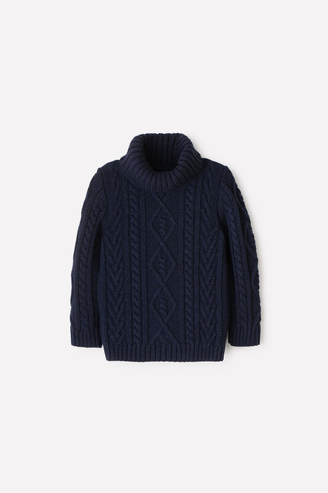 Теплый вязанный джемпер из полушерстяной пряжи в состав которой входит шерсть австралийского мериноса. У изделия высокий, эластичный воротник, переплетение косы.