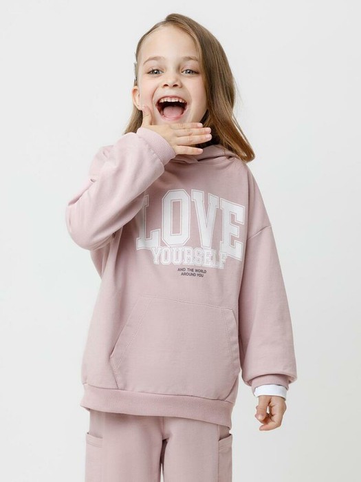 Толстовка с капюшоном для девочки из мягкого петельчатого футера. На рукавах и по низу изделия эластичные манжеты и пояс. Спереди удобный карман-кенгуру. Принт выполнен из стойких текстильных гипоаллергенных красителей.