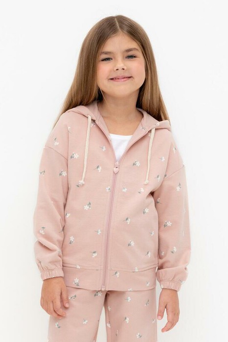 Трикотажная толстовка на молнии с капюшоном для девочки из мягкого набивного футера петли. Модель с боковыми карманами и манжетами на резинке.