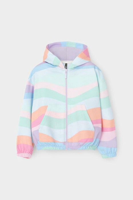 Трикотажная толстовка с капюшоном для девочки из мягкого набивного футера петли. Модель застёгивается на молнию, спереди два кармана. Пояс и манжеты на резинке.
