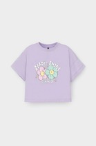 Футболка укороченная для девочки из высококачественного трикотажного полотна. Оригинальный принт выполнен из стойких текстильных гипоаллергенных красителей. Для удобства одевания на спинке в размерах 92 и 98 есть застежка на кнопки.