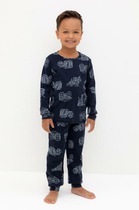 Трикотажная пижама из натурального хлопка. Джемпер с длинными втачными рукавами и брюки с эластичной резинкой в поясе. Мягкие манжеты на рукавах и по низу брюк. Оригинальная набивка выполнена из стойких текстильных гипоаллергенных красителей. Изделие сохраняет цвет и форму после многократных стирок. Все трикотажные полотна производятся в соответствии с нормами швейцарского сертификата ЭкоТекс.