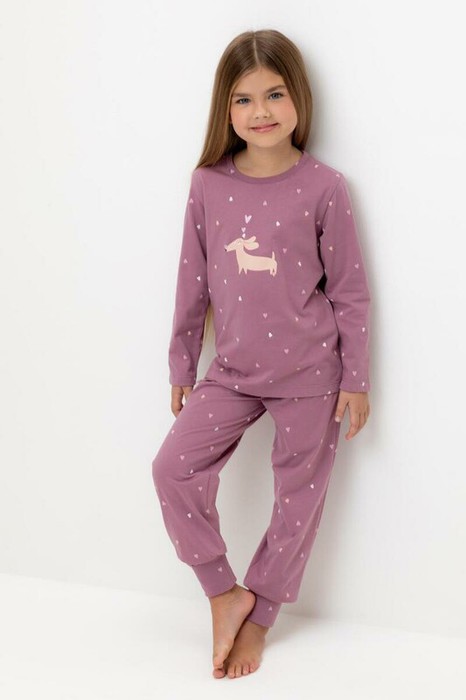 Пижама для девочки из натурального хлопка. Джемпер с длинными втачными рукавами и брюки с эластичной резинкой в поясе. Мягкие манжеты по низу брюк сделаны из материала в рубчик. Оригинальная набивка и принт выполнены из стойких текстильных гипоаллергенных красителей. Изделие сохраняет цвет и форму после многократных стирок. Все трикотажные полотна производятся в соответствии с нормами швейцарского сертификата ЭкоТекс.